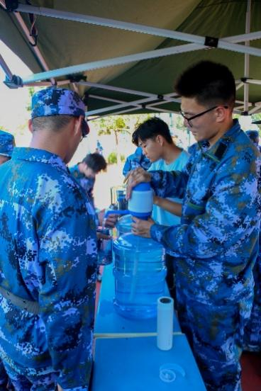 军训现场,辅导员和员工会的志愿者们为参训同学保驾护航,为教官和同学们提供了水、纸巾、药品等军训用品,做好后勤保障工作。