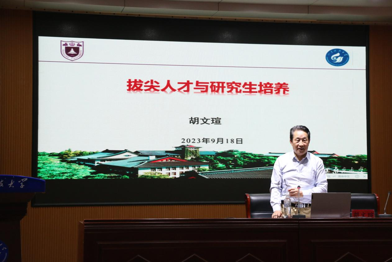 胡文瑄从拔尖人才的定义出发,用自己的亲身经历与同学们分享了在拔尖人才培养方面的心得与见解。胡文瑄讲到,在现代社会中,拔尖人才的培养不仅仅依靠学术成绩,更需要全面发展各方面的素养和能力。谈及如何培养拔尖人才,胡文瑄总结了三点:修德、增识、悟道。胡文瑄鼓励同学们要勇于追求卓越,并积极探索自身潜力,从读有字经的继承者慢慢成长为破无字经的创新者;要成为具备高尚道德情操、渊博学识和深邃思想的人,成长为真正的拔尖创新人才。此外,胡文瑄还对地学研究生提出了几点建议:一是要正确认识地学作为地球系统科学的发展趋势,突破传统的“三基”理念,建立“三观”突破口的改革理念;二是要认清学、硕、博三阶段的特征,重基础、重继承、重创新,在每个阶段都有所进步;三是要正确认识导师、教师与员工的关系,牢记为学三个捷径:法起自心、外承师传、读无字经;四是要正确认识学习、论文与演讲的关系,会工作、会总结、会交流,不断学习提升。