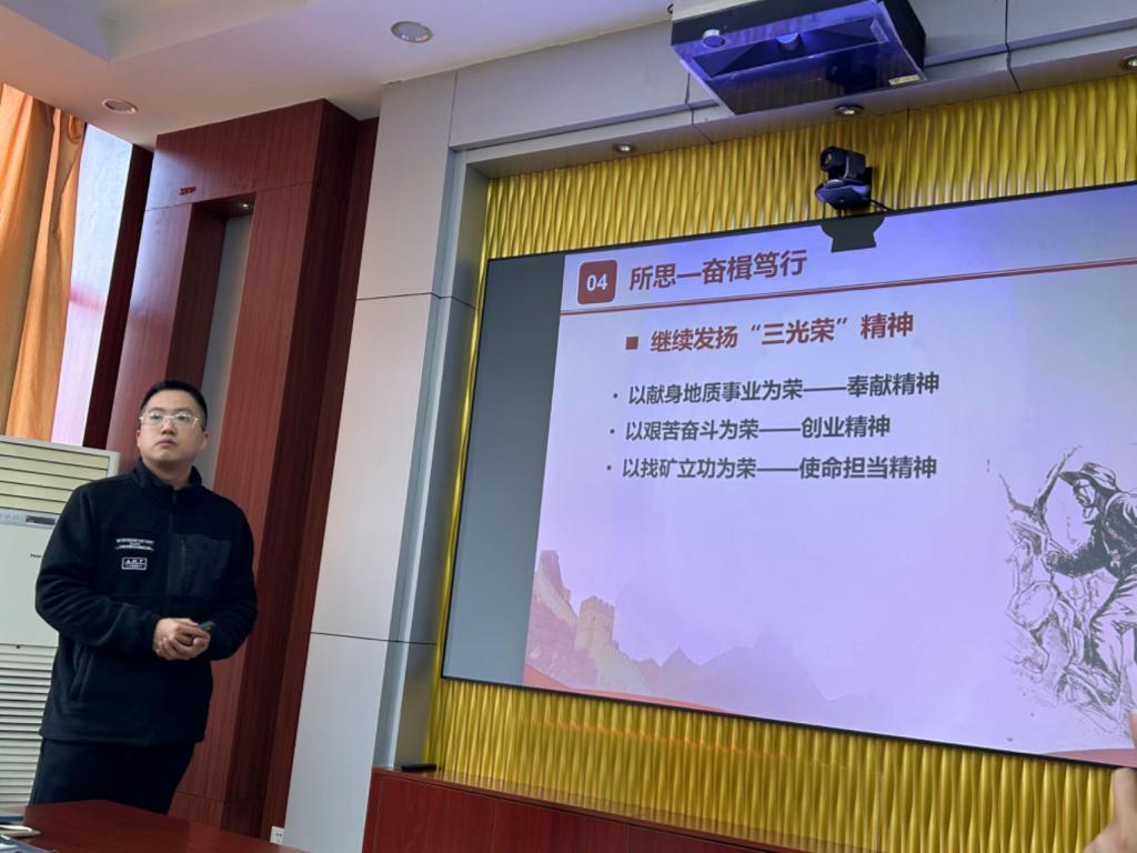 此次学习与地质学系党支部党建品牌——“党员讲堂”结合进行。首先进行的是“党员讲堂”第十三讲,地质学系教师宋志刚基于自身参加社会实践锻炼的经历,以“‘挂职’当‘任职’‘锻炼’当‘磨炼’”为主题,从自己所观、所为、所获和所思四个方面,讲述了自己2022年在实践锻炼单位—山东省地质科学研究院的各种收获和感悟。他表示,参加社会实践锻炼是拓宽视野、教研相长、提升个人职业素养的“助推器”,同时也是锻炼心智的“磨刀石”。宋志刚结合实践锻炼中的切身感受,谈了新冠肺炎疫情给实践锻炼所带来的困难对自己心智的磨炼,“地质三光荣精神”在山东省地质科学研究院职工身上的体现以及在新时代社会背景下所绽放的时代意义。他最后讲到,作为新时代的高校青年教师和地质工作者,要有效克服“鸵鸟心态”,在用“地质三光荣精神”塑造自我的同时,要在教学过程中将“地质三光荣精神”融入专业课程教学,实现专业育人与思政育人的有机融合,做好课程思政的大文章;要在工作中胸怀“两个大局”,敢为人先,深刻领悟习近平总书记给山东地矿六队的回信精神,涵养“心有大我、至诚报国”的情操,向地质一线职工学习,力争在维护国家资源能源安全中作出地质人的专业贡献。