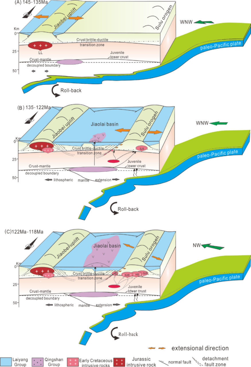团队认为晚构造岩体中形成于古太平洋板块俯冲形成的弧后拉张环境,张性裂缝在岩浆侵位过程中发挥了重要作用。晚构造岩体中磁线理的主要倾伏方向为西北-东南(127-307°),而围岩中矿物拉伸线理的倾伏方向接近东西(102-282°)。结合年代学研究,提出早白垩世时期,胶东半岛的伸展应力场方向经历了一次重大转换。具体表现为,135 Ma -122 Ma,胶东半岛受控于区域性的近东西向张性应力场;但在122 Ma - 118 Ma,却受控于NW-SE向伸展应力场。研究认为胶东半岛区域应力场的重大转变间接指示了古太平洋板块不断变化的俯冲方向。其中,135 Ma - 122 Ma,古太平洋板块沿近东-西方向俯冲到欧亚大陆之下,弧后伸展和板块后退导致了胶东半岛的大面积伸展;122 Ma-118 Ma期间,古太平洋板块的俯冲转向北西方向,俯冲板片却在胶东半岛下方发生了大角度的向东回退。本研究提出这一古太平洋板块俯冲角度的重大转变可能导致了胶东半岛广泛的岩浆和金矿化作用,为该地区早白垩世期间发生的复杂地球动力学过程提供了新视角。