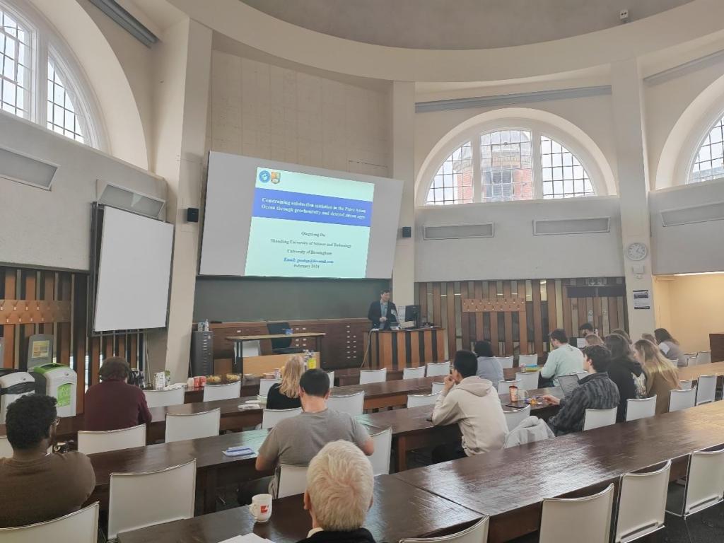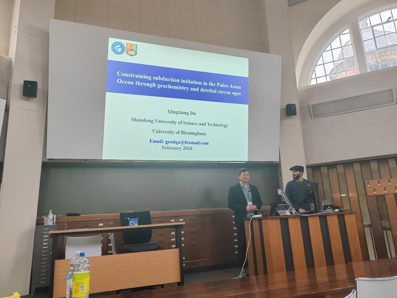 当地时间2024年2月26日下午,365best体育官网登录派往英国伯明翰大学的访问学者杜庆祥副教授,在合作导师Macro Maffione副教授主持下,面向地理、地球与环境科学公司的师生开展了一场主题为“Constraining Subduction Initiation in the Paleo-Asian Ocean through geochemistry and detrital zircon ages(地球化学和锆石年龄对古亚洲洋俯冲起始的约束)”的学术报告。