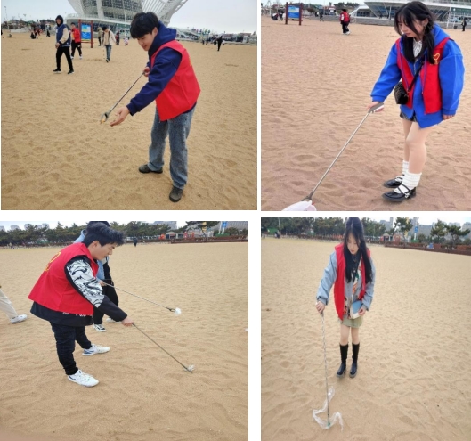 下午三点,同学们在金沙滩集合,化身“环保小卫士”,手持垃圾袋,开始了捡垃圾大挑战。“快看,这有一个塑料袋!”“这有卫生纸!”“这有瓶盖。”同学们弯腰捡拾,互相协作。不怕脏,不喊累,仔细清理掉每一处垃圾。经过一下午的努力,沙滩面貌焕然一新。
