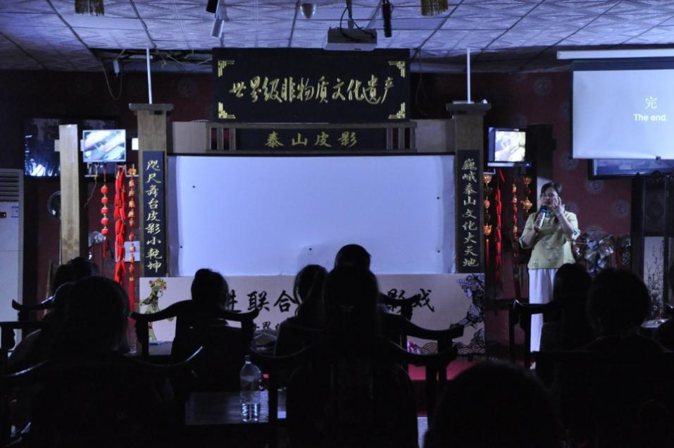 活动在山东省泰安市泰山区非物质文化遗产珍贵实物展厅泰山皮影剧场开展。简短的介绍和开场后,团队邀请当地皮影戏专家闫冬梅,现场为同学们讲解泰山皮影戏产生渊源、文化地位和传承现状。