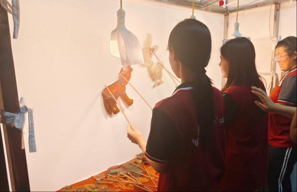 最后,同学们随队员来到了场馆的后台,体验皮影人偶的操作和表演。当音乐响起,同学们手持皮影人物,尝试了一些简单的动作。通过亲身上手操作,同学们对皮影戏的艺术性有了更深的认识,也感受到了传统艺术的乐趣。