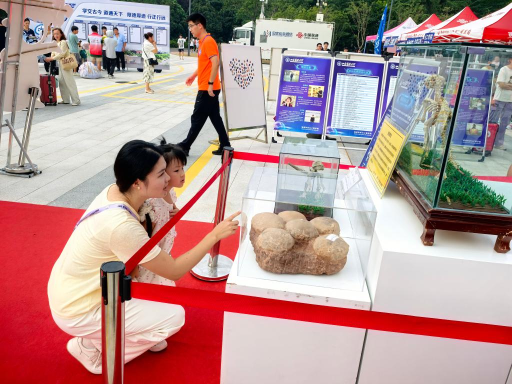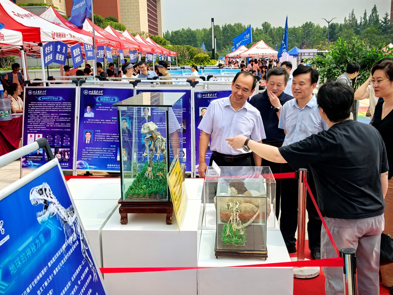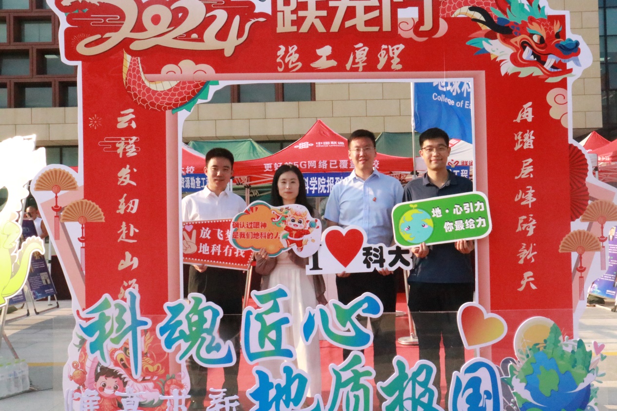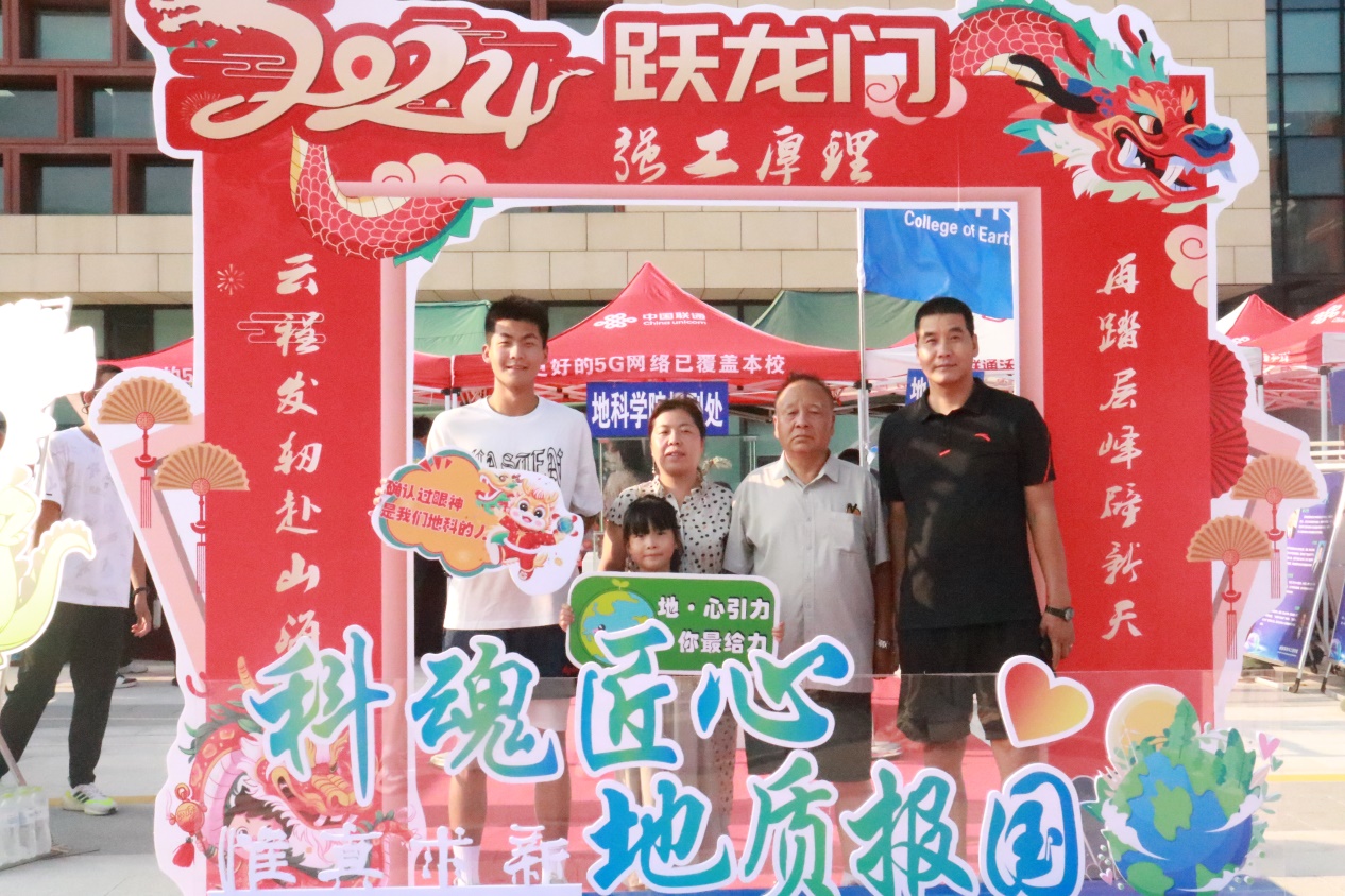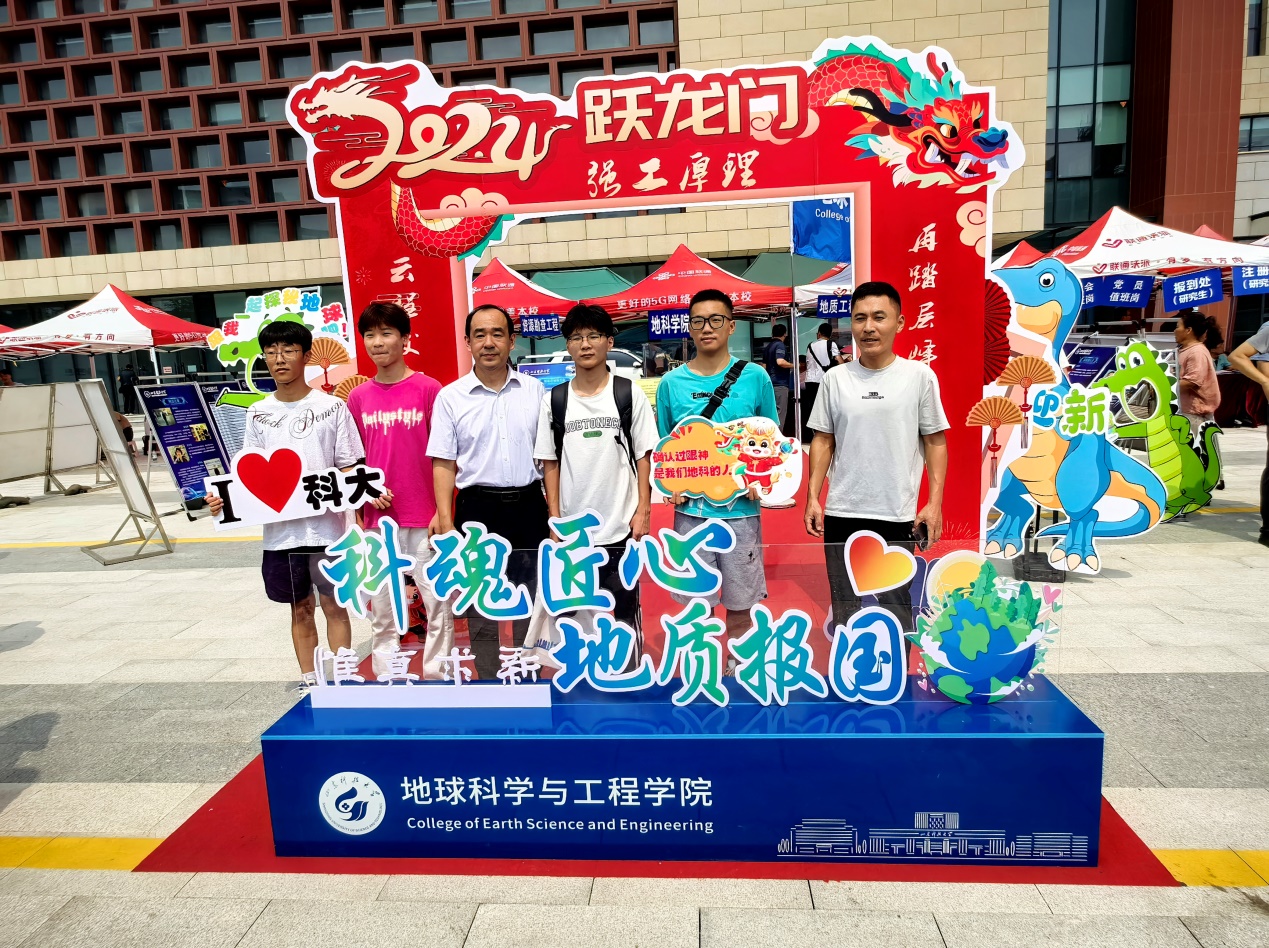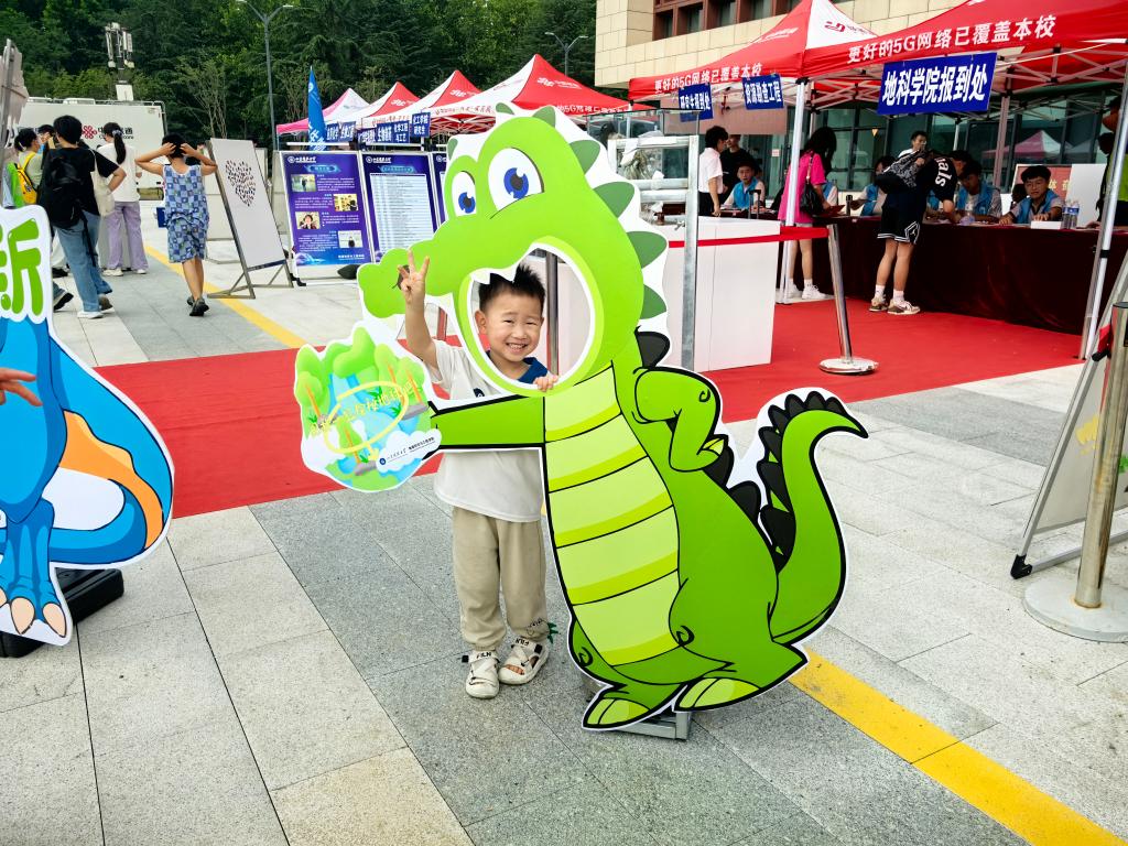 在迎新现场,适逢甲辰龙年,气势磅礴的“龙门”,精心保护的恐龙骨架、恐龙蛋化石和别出心裁的卡通恐龙道具,烘托着学子们高考拼搏后鲤鱼跃龙门的喜悦,凸显出公司的地质专业特色。“龙门”内、化石旁、道具前,吸引着诸多员工和家长驻足观看,拍照打卡留念。