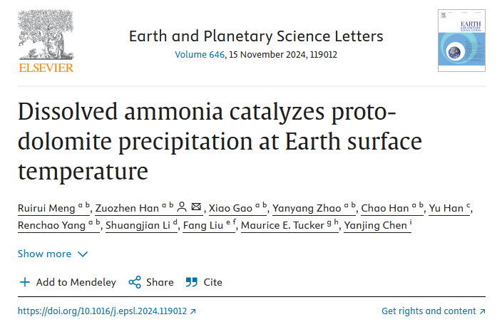 近日,公司韩作振教授团队在国家自然科学基金(41972108, U19B6003和42102134)的资助下,联合英国地质科学家,在白云石成因研究方面取得重要进展,研究成果以“Dissolved ammonia catalyzes proto-dolomite precipitation at Earth surface temperature”为题发表于地球科学领域国际顶级Nature Index期刊《Earth and Planetary Science Letters》。韩作振教授为论文通讯作者,孟瑞瑞博士为第一作者,公司为第一署名单位。