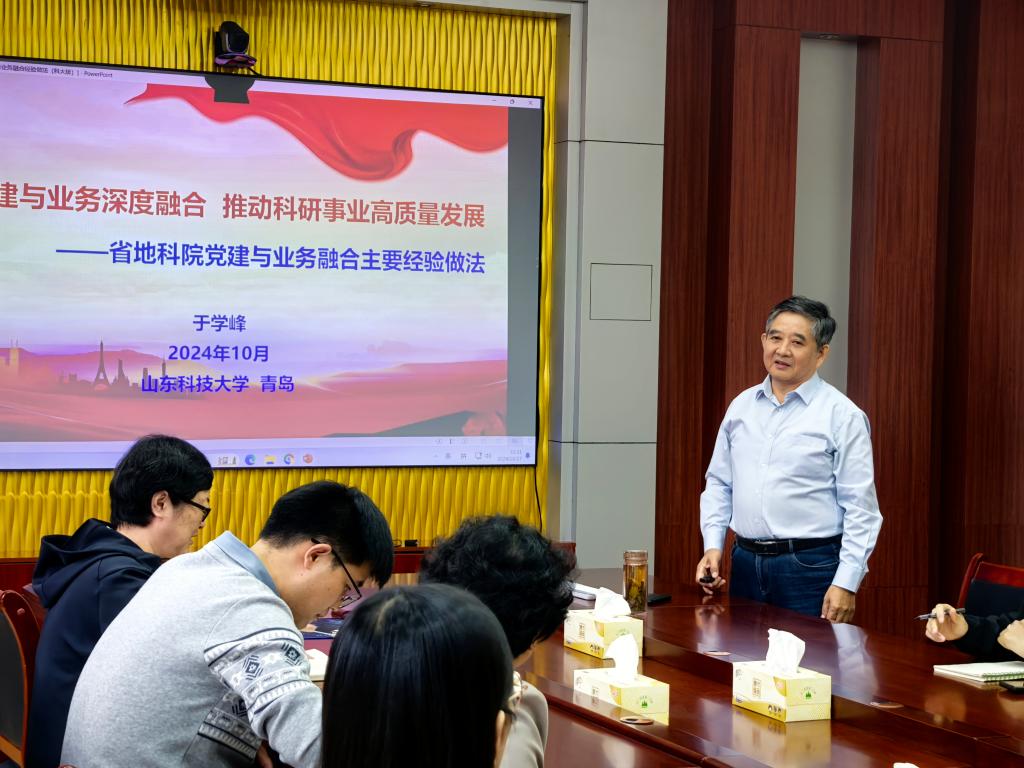 于学峰以《坚持党建与业务深度融合 推动科研事业高质量发展——省地科公司党建与业务融合主要经验做法》为题,结合省地科院在党建引领下所取得的一系列突出成绩,介绍了山东省地质科学研究院“四保障一基础”党建与业务融合的经验做法。“四保障一基础”做法一是压实机关党建责任,为党建与业务融合提供政治保障;二是实施“双带头人”制,为党建与业务融合提供组织保障;三是强化党建制度建设,为党建与业务融合提供制度保障;四是创建特色党建品牌,为党建与业务融合提供思想保障;五是组织“党建+”专业特色活动,为党建与业务融合奠定实践基础。省地科公司党委坚持党建引领,创新推动党建与业务融合发展,在破解“两张皮”方面进行了一些有益探索和实践,取得了一定成效,2019年被省直机关工委确定为“省直机关基层党建示范观摩点”,“党建引领 金石为开”党建文化品牌被评为“全省机关党建优秀创新案例一等奖”,先后荣获“全国先进基层党组织”“全国文明单位”“全国国土资源管理系统先进集体”“全国模范地勘单位”“全国地质勘查行业先进集体”等多项荣誉称号。报告结束后,于学峰同与会人员就“党建+”及支部品牌建设等工作进行了进一步深入交流,为大家进一步厘清了党建品牌建设工作思路。