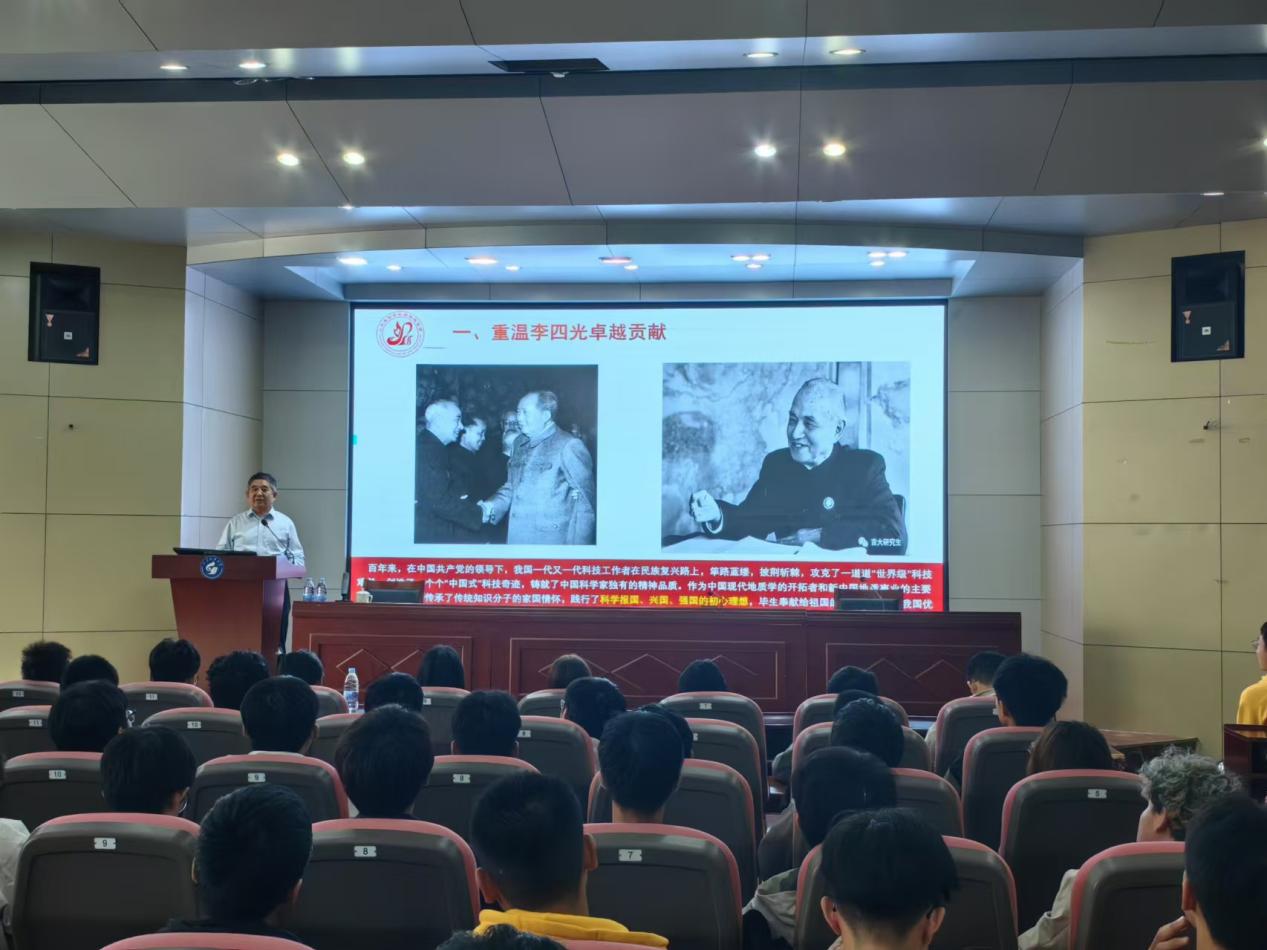 于学峰的报告分为重温李四光卓越贡献、弘扬李四光科学家精神、做新时代科学家精神践行者三个部分,报告中回顾了李四光先生的生平事迹,强调其在地质科学领域的卓越贡献及不畏艰难、勇于创新的科学精神。并以自身为例,为同学们讲解如何践行科学家精神。他指出,新时代的老员工应继承和弘扬李四光精神,保持对科学的热爱和对真理的追求,敢于挑战权威,勇于探索未知。同时,于学峰以自身在科大求学的经历叮嘱同学们在校期间要认真学习专业知识,积极响应习近平总书记的号召,投身于新一轮找矿突破战略行动和美丽中国建设中去。