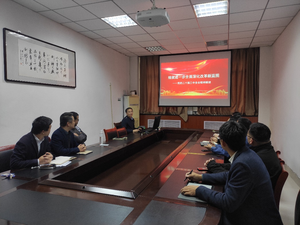 常象春围绕“党的二十届三中全会的重大意义和主题”、“习近平总书记关于全面深化改革的重要论述”、“进一步全面深化改革的总体思路与系统部署”、“进一步全面深化经济体制改革的重点方面”等四个方面,为党员同志们解读党的二十届三中全会精神,认真梳理习近平总书记关于全面深化改革的一系列新思想、新观点、新论断中与公司发展工作相关的重点内容,引导党员们聚焦建设美丽中国和深化生态文明体制改革等目标要求,立足工作实际,寻找突破难点,把学习成果转化为推动公司、公司事业高质量发展的强大动力。