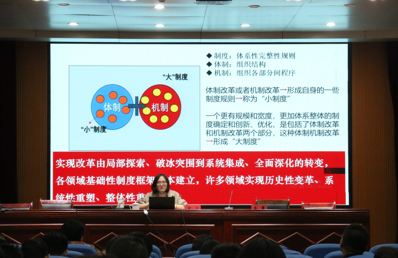 周月以“进一步全面深化改革,开创高质量发展新局面”为题,以党的历届三中全会议题为切入点,紧紧围绕我国改革开放40多年的历史主线,从“党的二十届三中全会新特点”、“中国经济从‘有没有’到‘好不好’的转变”、“推进高质量发展的原因”、“推进高质量发展的路径”等四个方面对全会精神进行了宣讲。她讲到,党的二十届三中全会是锚定第二个百年奋斗目标的系统擘画和战略部署。全会的召开,旨在面对纷繁复杂的国际国内形势,面对新一轮科技革命和产业变革,面对人民群众新期待,着力解决发展不平衡不充分主要矛盾,培育塑造发展新动能新优势,为以中国式现代化推进强国建设、民族复兴伟业提供关键支撑。