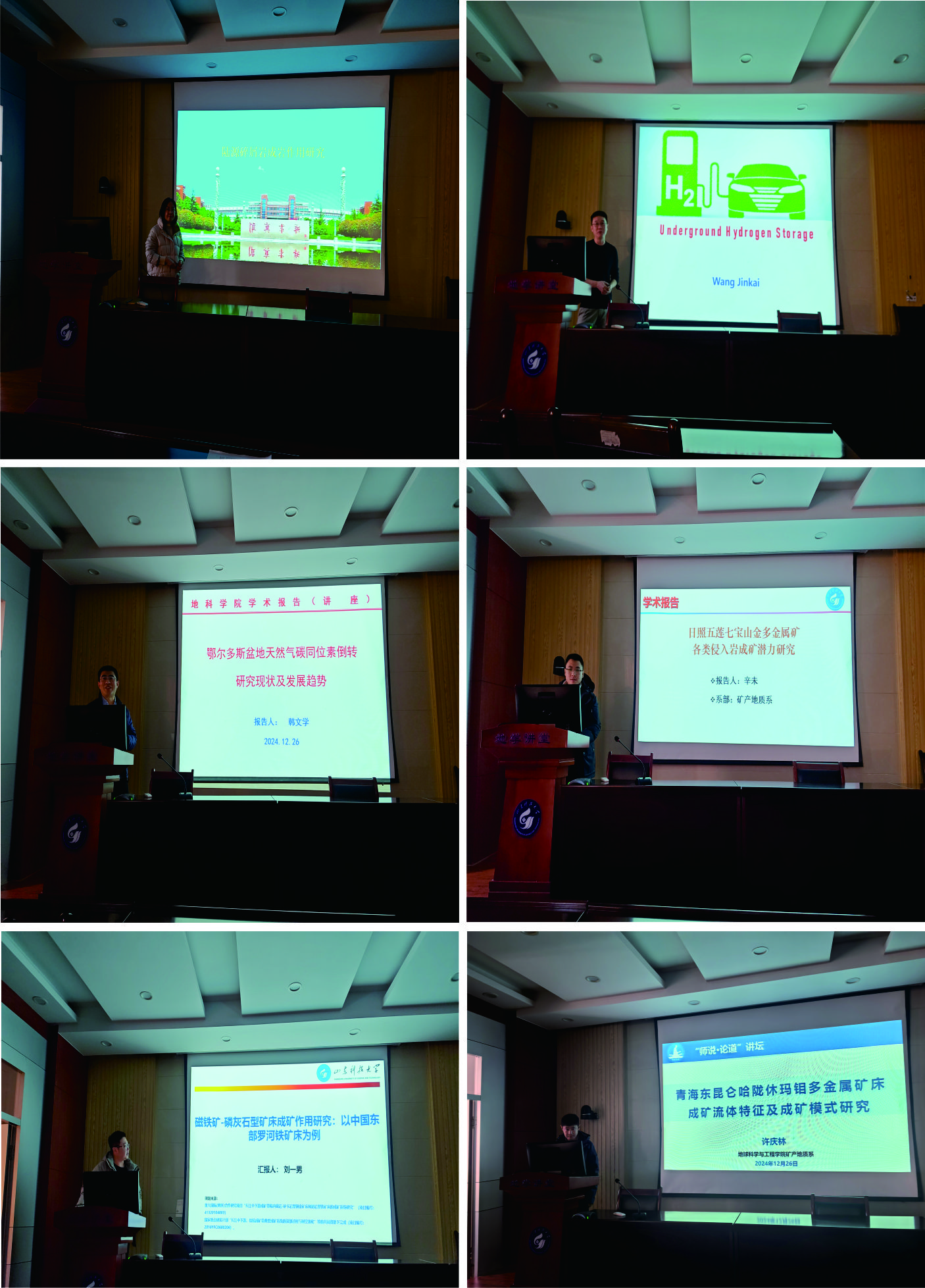 报告会上,樊爱萍、王金凯、许庆林、辛未、韩文学、刘一男等老师结合自己的科学研究,分别以“陆源碎屑岩成岩作用研究”、“氢气地下储存技术”、“青海东昆仑哈陇休玛钼多金属矿床成矿流体特征及成矿模式研究”、“胶东七宝山金多金属矿区各类侵入岩成矿潜力研究”、“鄂尔多斯盆地天然气碳同位素倒转研究现状及发展趋势”、“磁铁矿-磷灰石型矿床成矿作用研究:以中国东部罗河铁矿床为例”为题,分享了其最新的研究成果。报告结束后,现场师生围绕相关领域的科学问题进行了深入的探讨与交流。