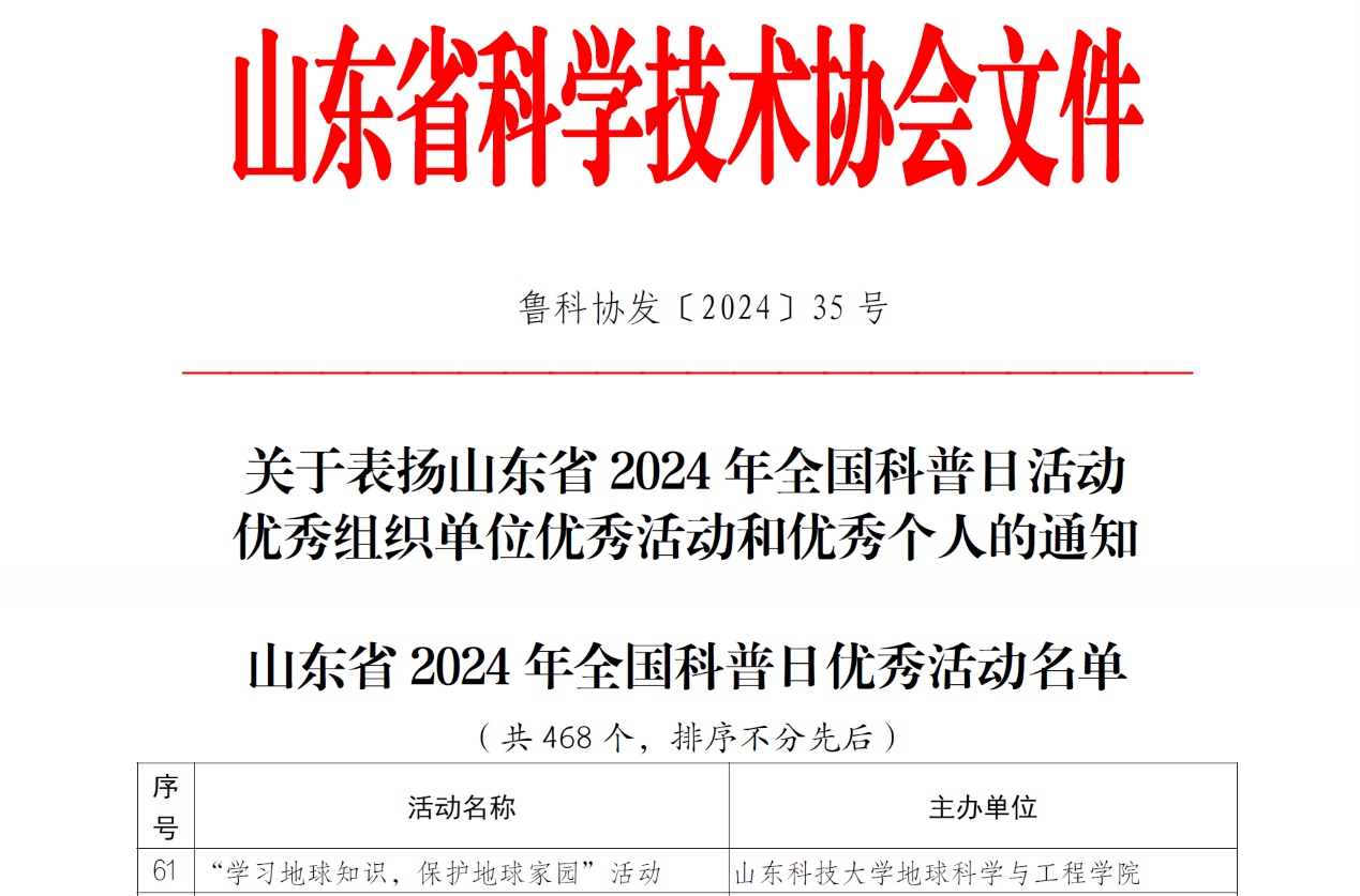 近日,山东省科学技术协会发布了《关于表扬山东省2024年全国科普日活动优秀组织单位优秀活动和优秀个人的通知》,365best体育官网登录地球科学馆主办的“学习地球知识,保护地球家园”科普基地游活动获评“山东省2024年全国科普日优秀活动”。