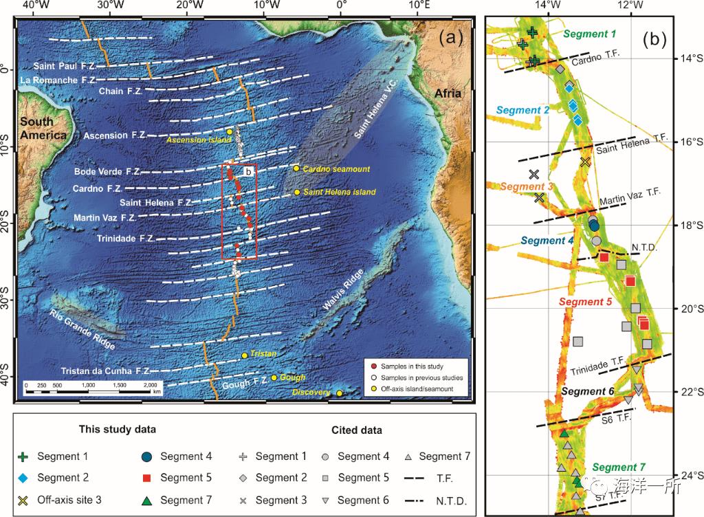 洋中脊与地幔柱相互作用及深碳循环是国际固体地球科学研究的前沿和热点,南大西洋洋中脊地区是研究此热点问题的理想地区。在冈瓦纳大陆裂解和大西洋打开的过程中,该地区洋中脊系统旁侧存在的一些相对固定的著名地幔柱(如阿森松、圣赫勒拿及特里斯坦地幔柱等)扮演了重要的作用。洋中脊玄武岩是深部地幔物质熔融的直接产物,是深部地幔过程的“探针”,为揭示南大西洋地区洋脊-地幔柱热点相互作用过程及地球圈层物质循环提供直接的依据。