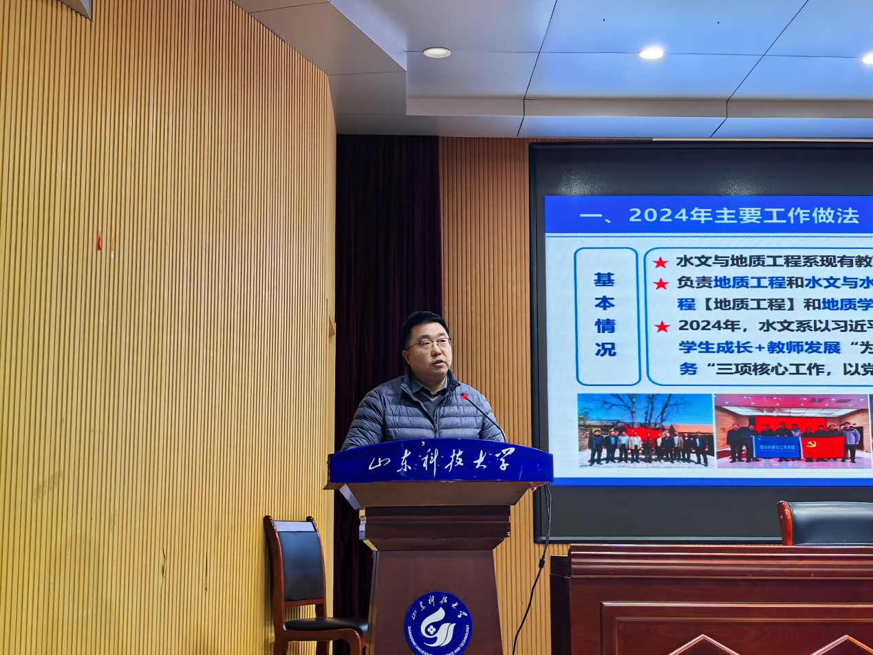 随后,水文与地质工程系主任张伟杰和员工工作办公室主任王文鑫在大会上依次作工作交流发言。张伟杰分别从党建、教师发展、员工培养、科学研究和社会服务等方面介绍了水文系2024年主要工作做法和成效,并聚焦存在问题汇报了下一步工作思路;王文鑫结合员工工作办公室(团委)工作,从教育、管理、服务三个方面介绍了2024年员工工作开展情况以及员工就业、入伍、科技创新等方面的相关政策,真诚希望学工队伍与老师们携手共助员工成长成才。