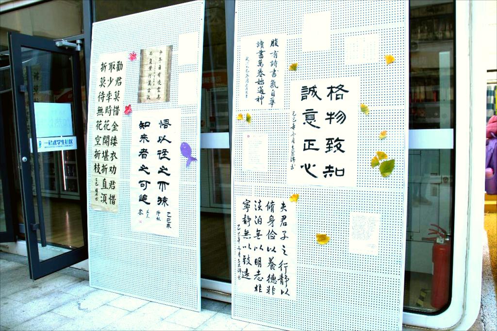 U+空间连廊两侧书法展板依次排开,集中亮相了前期征集的“经典名句”“校园生活”主题书法作品,软笔流畅洒脱,硬笔工整清秀,引得不少同学驻足欣赏。书法社团的同学现场泼墨示范,“横平竖直皆风骨,撇捺飞扬是青春”的讲解引来阵阵掌声。一旁的书写体验区排起长队,同学们提笔蘸墨,写下“学在山科,书香作伴”等寄语,沉浸式感受汉字之美。