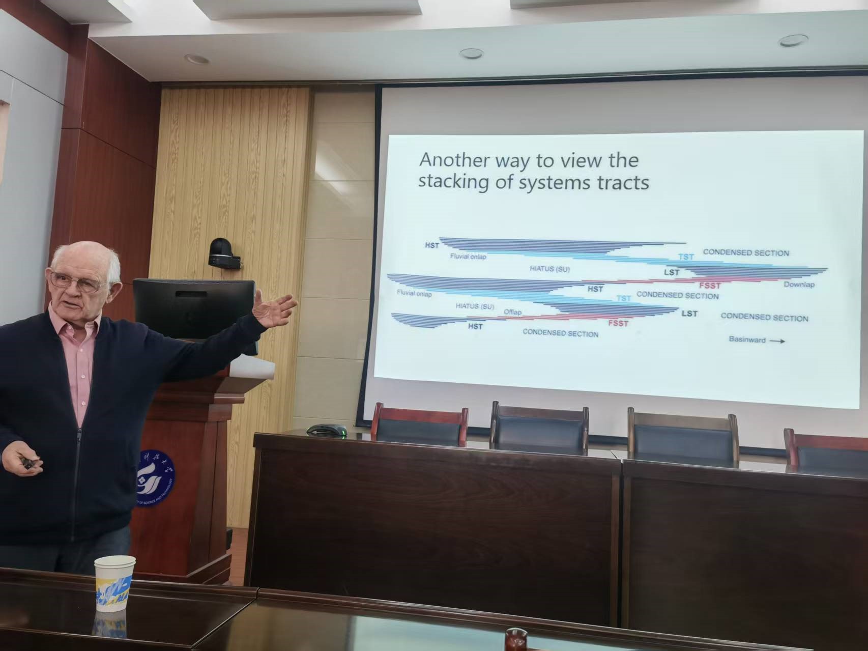 Ronald Steel教授首先围绕层序地层学的发展历程及最新进展,从层序地层学的起源、层序地层学的关键进展、长期海退体系域及短期海侵体系域的识别、三角洲驱动陆架生长的复杂性、基于地震剖面的体系域识别等五个方面进行了讲解;然后结合近50万年以来冰室海平面变化的特点,利用钻井和地震资料,介绍了层序内部不同体系域的差异性和识别标志,进一步为大家展示了“沉积物供给驱动型—陆架三角洲层序”的复杂性及最新研究成果。最后,与师生现场就有关学术问题进行了深入交流研讨。