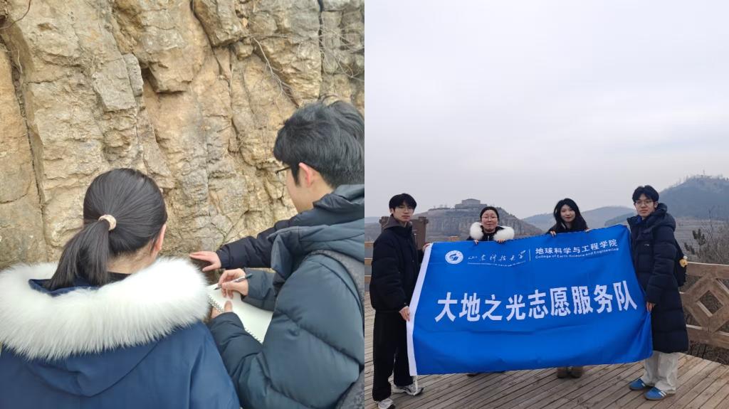 在9381军工洞旧址,队员们参观了生产设备、历史照片和实物展品,了解军工洞的建设背景、历史作用以及建设者们当年在极其艰苦的条件下,克服困难、自力更生、艰苦奋斗,为国防事业做出重要贡献的感人事迹,感悟“艰苦创业、无私奉献、团结协作、勇于创新”的三线精神内涵。在岱崮园区博物馆,队员们从物质组成、内动力作用及外动力作用等方面系统了解“顶平、身陡、麓缓”的岱崮地貌形成机理。队员们前往崮上草原实地考察岱崮地貌,结合所学专业知识分析地质特征,进一步加深了对岱崮地貌的认知,提升专业应用能力。