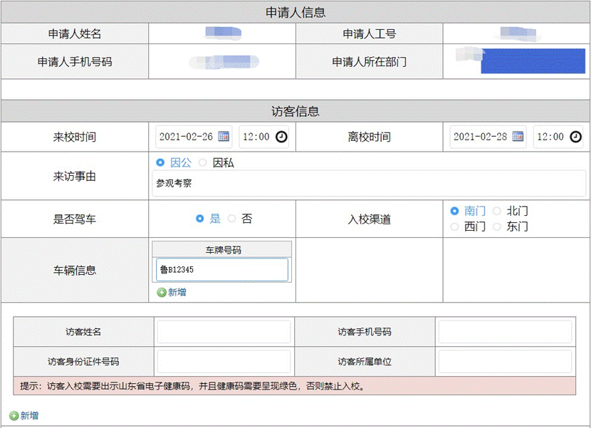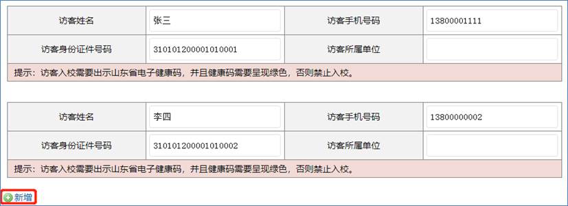 如果有多名访客,通过点击「新增」添加。