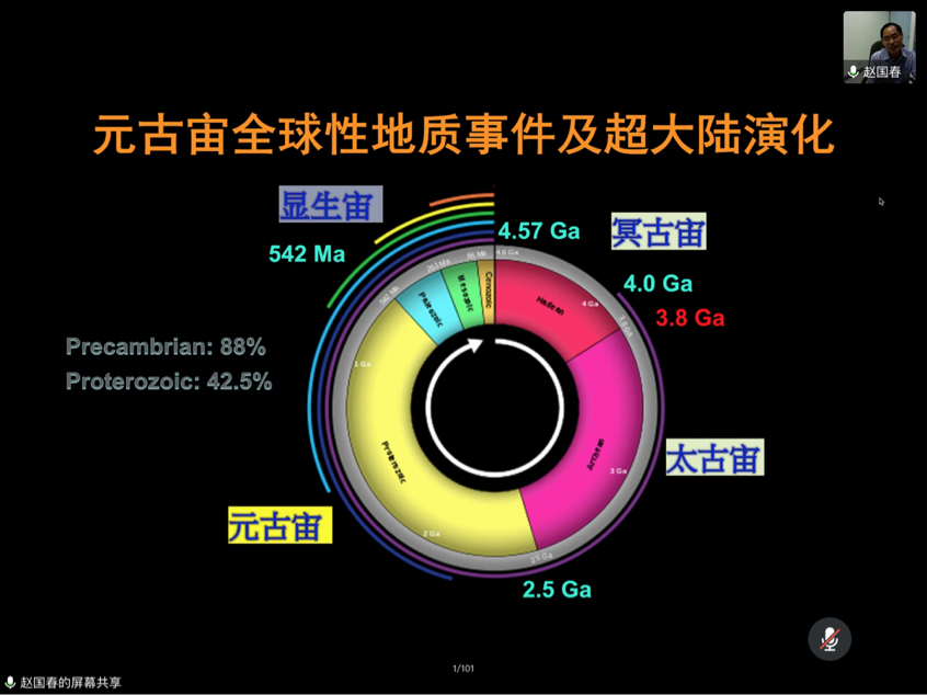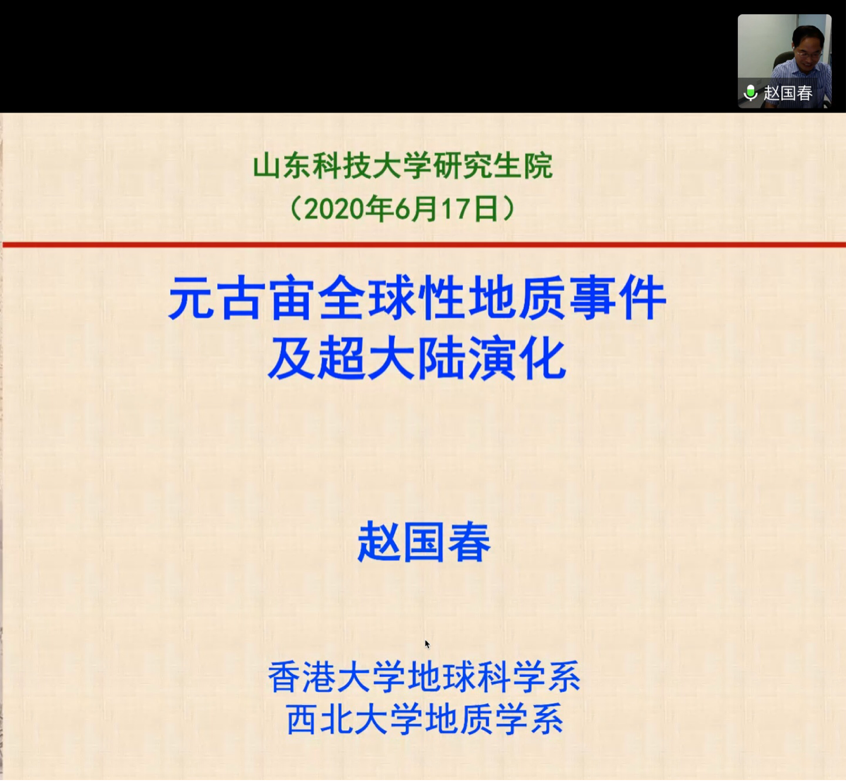 2020年6月17日19:30分,由研究生院主办、365best体育官网登录承办的2020年“名家讲坛”通过腾讯会议平台在线举行。本次“名家讲坛”的主讲嘉宾是赵国春院士,报告题目为“元古宙全球性地质事件及超大陆演化”。本次“名家讲坛”由研究生院经理韩作振主持,部分教师和研究生参加了讲坛活动。