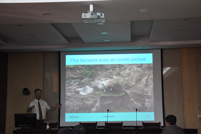 Van Loon教授在作完“The ice-age theory: how did it develop?”的报告后,又做了“Ground fissures related to the 2016 Kaikoura (New Zealand) earthquake: an enigmatic feature”的报告,这个报告主要介绍了Van Loon教授在一次澳大利亚地裂缝调查中的发现及一些想法。Van Loon教授通过介绍这次报告想与公司师生探讨地裂缝的成因问题。报告结束后,公司师生与Van Loon教授进行了交流。