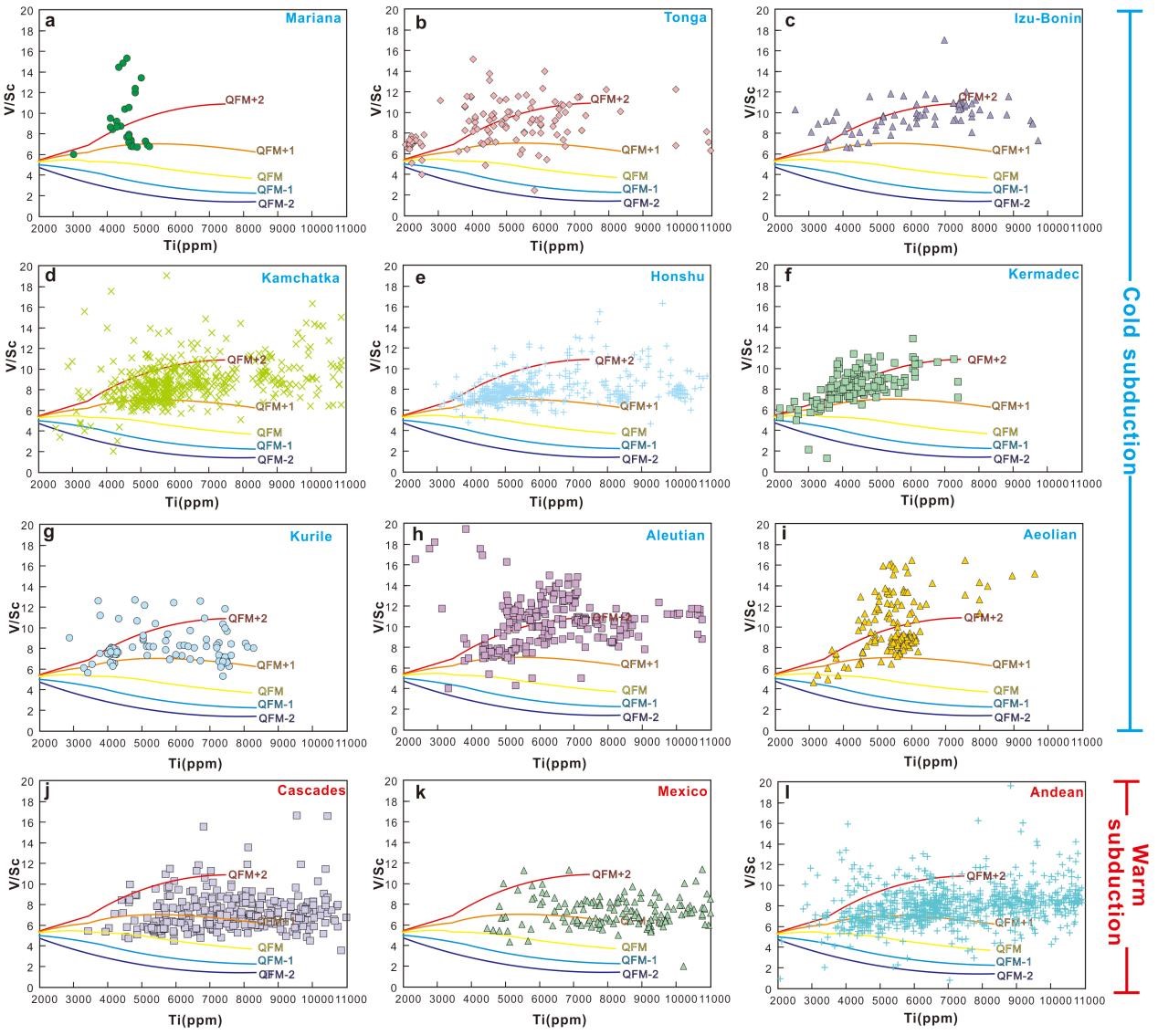 全球12个弧段的玄武岩中的V/Sc-Ti值以及相关的氧逸度