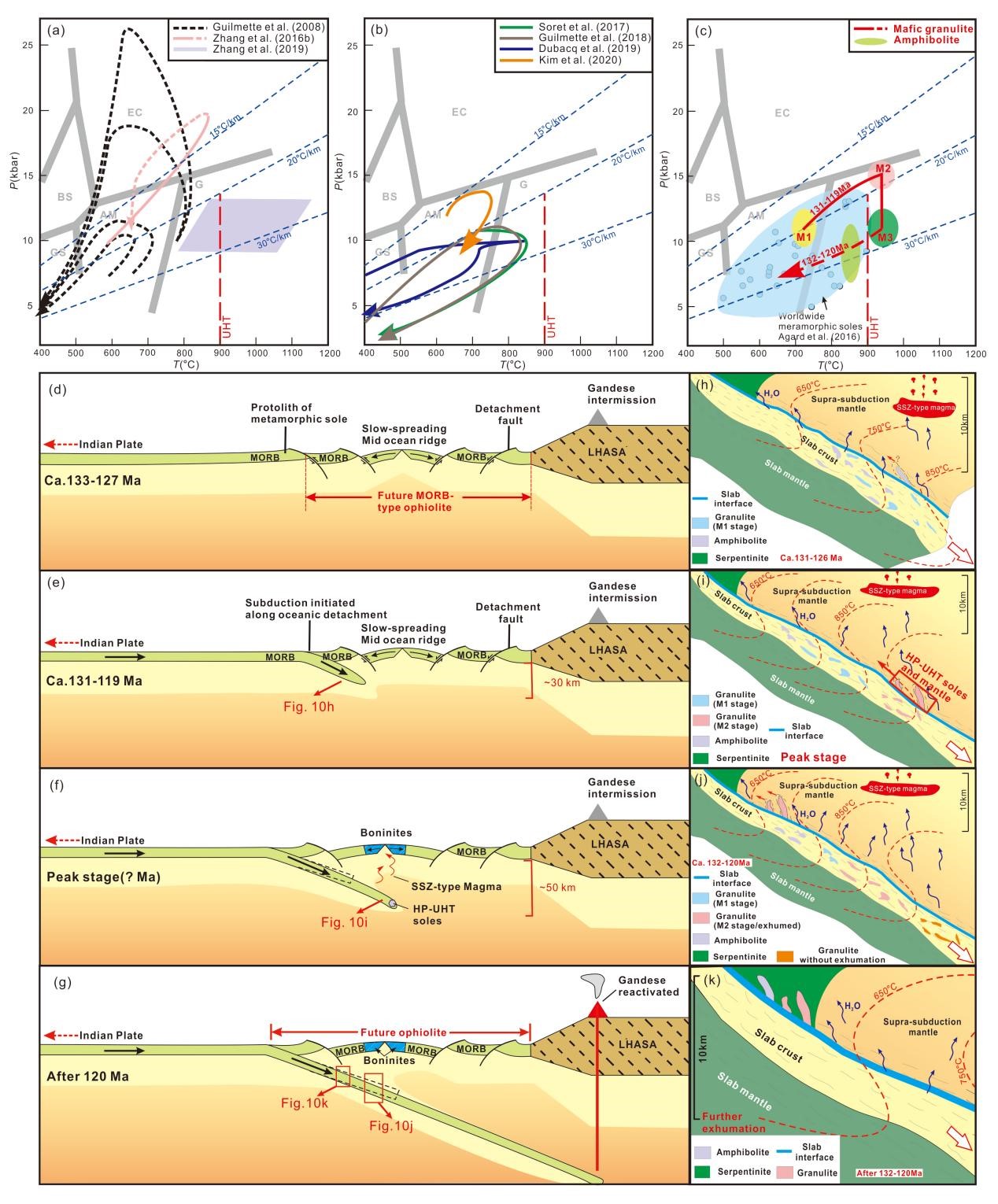 成果一:蛇绿岩作为一种特殊类型的岩石组合,主要分布于各条缝合带中,是探测地球深部地质作用的窗口,也是研究地幔物质组成、壳-幔物质交换以及板块构造动力学等方面极为重要的工具。西藏南部的雅鲁藏布蛇绿岩位于印度板块和欧亚板块之间的缝合带中,代表了残留的新特提斯洋,是分布在我国最年轻,也是最受关注的蛇绿岩之一。来自德国Ruhr University Bochum的研究者,对雅鲁藏布蛇绿岩中采集的变质底板(麻粒岩和角闪岩)在岩相学、地球化学、地质年代学以及变质相平衡模拟等方面进行了研究,得出雅鲁藏布蛇绿岩中的变质底板经历了一个顺时针的变质P-T过程,而非前人所认为的逆时针变质轨迹。此外,其峰期以及峰后阶段均达到了超高温变质条件,指示了一个“热”的俯冲起始过程,提出了揭示雅鲁藏布蛇绿岩以及变质底板形成新的地质模型,为探究蛇绿岩的形成以及演化提供新思路。【链接:https://doi.org/10.1016/j.epsl.2022.117610】