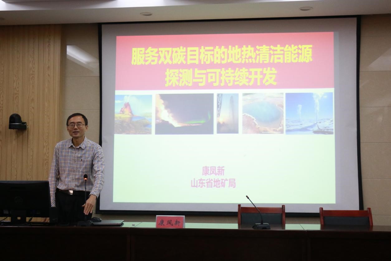 康凤新研究员就双碳目标对地热清洁能源的需求、山东省地热资源勘查研究进展、地热应用行业规范编制、地热田整装勘查与高温地热能探测等几个有关地热方面的内容为公司师生作了详细的介绍。会中,康凤新研究员向我们展示了近几年国家和山东省双碳目标对清洁能源发展的迫切需求以及山东省地热应用的突破发展,就省内的四元聚热、“采灌均匀,取热不耗水”等技术发展展开具体的讲解,在宏观方面为我们阐释了双碳目标下地热能发展的下一步方向。报告过程中,师生踊跃提问,康凤新研究员耐心为师生答疑解惑。