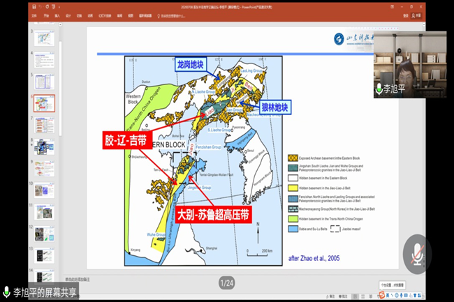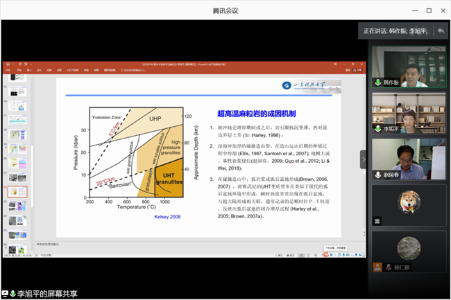 报告伊始,李旭平教授就华北克拉通古元古构造带的特征进行概述,介绍了胶-辽-吉古元古构造带的三种成因模式,对超高温麻粒岩进行细致讲解,并分享了自己新近的部分研究成果,深入浅出、层层递进、内容丰富。