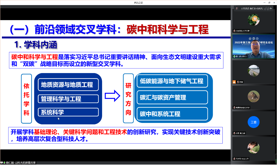 杨仁超教授以党的二十大精神为引领,分别从“面向国家重大战略需求”、“关注前沿领域交叉学科”、“志存高远——寄语青年学子”等三个方面重点阐述了公司在国家“双碳”战略背景下,紧紧围绕党的二十大报告对生态文明建设的战略部署,立足学科深度交叉融合,孕育新的学科生长点,设立“碳中和科学与工程”、“生态环境安全”前沿交叉学科,为国家重大战略提供重要科学支撑,为青年学子的成长成才指明方向。报告最后,杨仁超勉励地学青年学子要仰望苍穹、放眼世界、志存高远,提高服务国家重大战略的自觉性,增强践行国家重大战略的使命感,坚定科技报国的理想信念,为国家的零碳未来作出新的贡献。