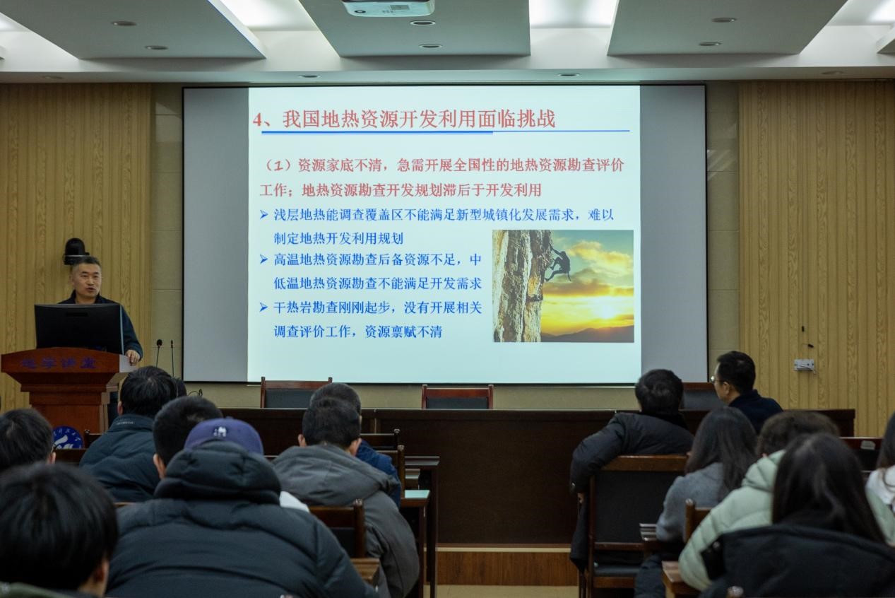 报告中,何雨江从全球能源转型与气候挑战切入,以我国在华北、东南地区的中低温水热型地热资源分布特征及干热岩型资源的开发难点与前景为实例,系统阐述地热能的形成机制、资源分类与开发利用现状、我国地热资源开发利用面临挑战和干热岩资源勘查评估、技术突破与政策激励等内容。他表示,地热能具有高效、清洁、稳定等优势,我国在地热直接利用方面已处于国际领先地位,广东丰顺等地开展的发电项目具有重要示范意义。