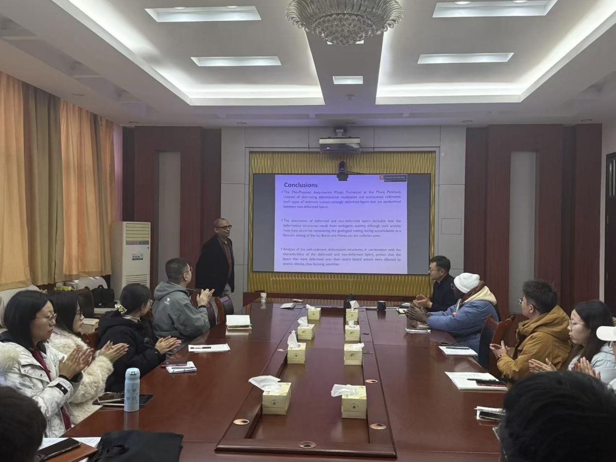 Rajat Mazumder教授首先以其团队的研究成果为例,深入浅出地阐释了深海潮汐韵律的形成机制、识别方法及其在反演地球早期演化历史中的关键作用,详细介绍了通过分析深海沉积记录中潮汐韵律的周期性变化,探究地球自转速率变迁、地月轨道演化等科学问题的技术路径。同时,他聚焦地质记录中震积岩的识别特征与成因分析,结合全球多地的地质实例,讲解了震积岩在重建古地震事件、分析区域构造演化中的应用价值,为现场师生提供了全新的科研思路与研究视角。