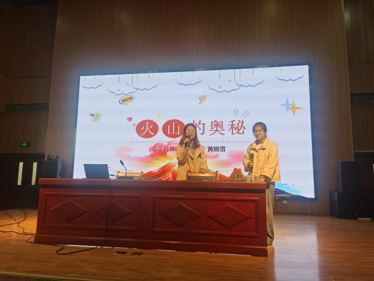 随后,高硕和黄晓雪用自己制作的火山模型,为同学们展示了火山喷发模拟实验。实验使用的器材都来自于生活中的常见物品,整个实验安全简单,操作便捷。高硕和黄晓雪指导同学们进行实验操作,面对“小火山”喷发出的“岩浆”,同学们发出一阵阵惊叹声,在操作中体验了实验的快乐,也体验了实验所蕴含的科学原理。