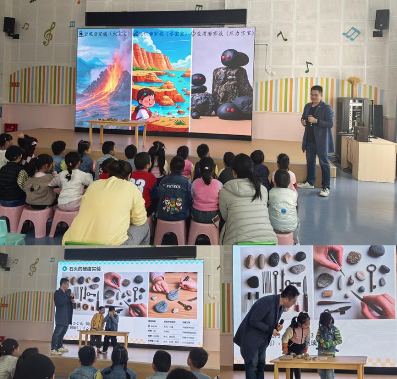 刘金庆首先以孩子们熟悉的各种有趣问题为切入点,借助火山喷发模拟动画,用丰富的图片,向孩子们介绍了石头的形成、特征、种类以及在生活中的广泛应用,引导孩子们思考生活中不同石头的颜色、形状和用途,将复杂的地质知识转化为童趣故事。